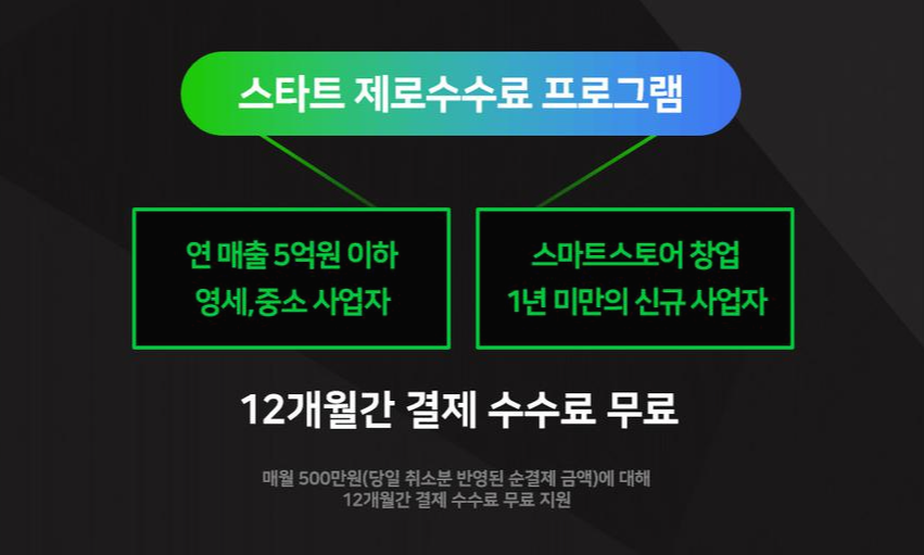 그것은 바로바로 '스타트 제로 수수료 입니다. 해당 조건은 2가지중 하나에만 해당되면 되며 12개월간 결제 수수료를 무료로 진행합니다 단 매월 500만원에 대한 한정금액입니다. 여러개의 스토어팜을 운영하고 있다고 하더라도 하나의 스토어만 적용됩니다.
